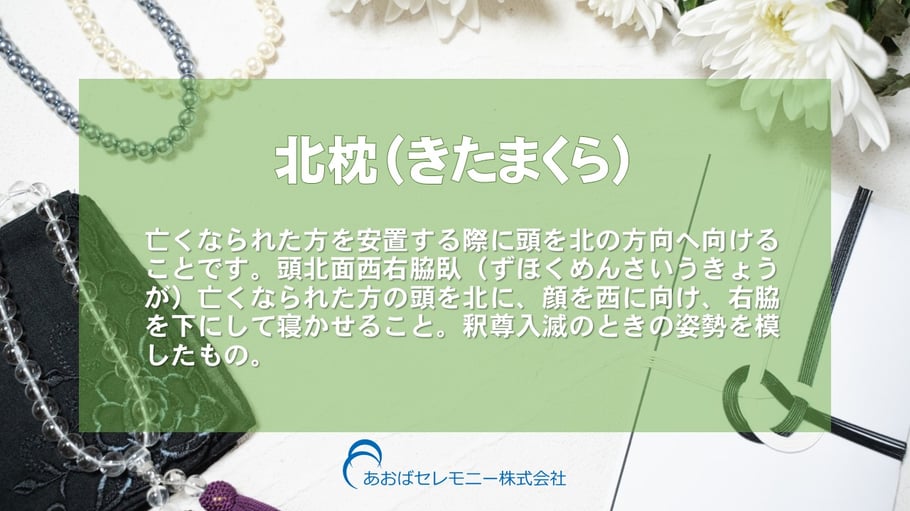 北枕(きたまくら) 亡くなられた方を安置する際に頭を北の方向へ向けることです。頭北面西右脇臥(ずほくめんさいうきょうが)亡くなられた方の頭を北に、顔を西に向け、右脇を下にして寝かせること。釈尊入滅のときの姿勢を模したもの。 千葉市のやさしい葬儀社~あおばセレモニー そのかたらしいお別れをしていただけるように、大切なかたのご葬儀を一緒に考えさせていただきます。0120-979-940 tagPlaceholderカテゴリ: