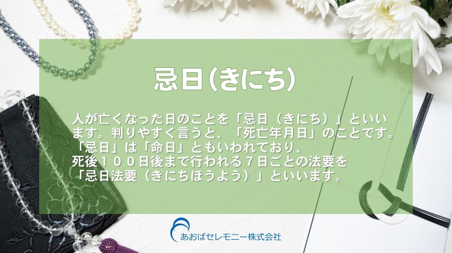 忌日(きにち) 人が亡くなった日のことを「忌日(きにち)」といいます。判りやすく言うと、「死亡年月日」のことです。「忌日」は「命日」ともいわれており、死後100日後まで行われる7日ごとの法要を「忌日法要(きにちほうよう)」といいます。 千葉市のやさしい葬儀社~あおばセレモニー そのかたらしいお別れをしていただけるように、大切なかたのご葬儀を一緒に考えさせていただきます。0120-979-940 tagPlaceholderカテゴリ: