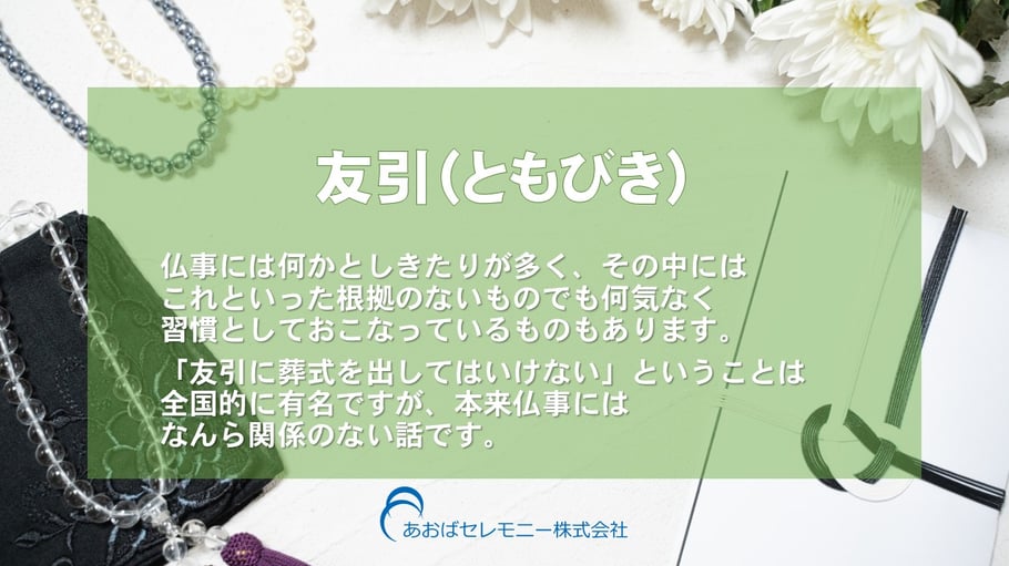 友引(ともびき) 仏事には何かとしきたりが多く、その中にはこれといった根拠のないものでも何気なく習慣としておこなっているものもあります。「友引に葬式を出してはいけない」ということは全国的に有名ですが、本来仏事にはなんら関係のない話です。 千葉市のやさしい葬儀社~あおばセレモニー そのかたらしいお別れをしていただけるように、大切なかたのご葬儀を一緒に考えさせていただきます。0120-979-940 tagPlaceholderカテゴリ: