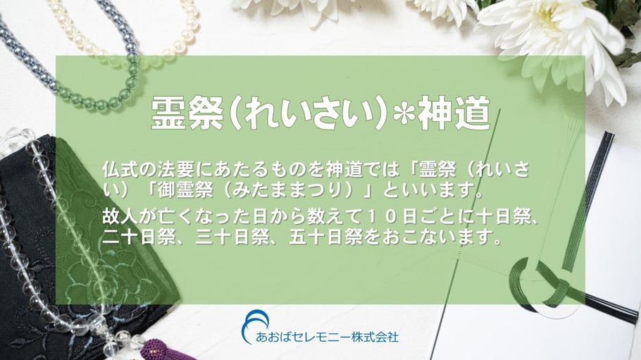 霊祭(れいさい)*神道 仏式の法要にあたるものを神道では「霊祭(れいさい)「御霊祭(みたままつり)」といいます。故人が亡くなった日から数えて10日ごとに十日祭、二十日祭、三十日祭、五十日祭をおこないます。 千葉市のやさしい葬儀社~あおばセレモニー そのかたらしいお別れをしていただけるように、大切なかたのご葬儀を一緒に考えさせていただきます。0120-979-940 tagPlaceholderカテゴリ: