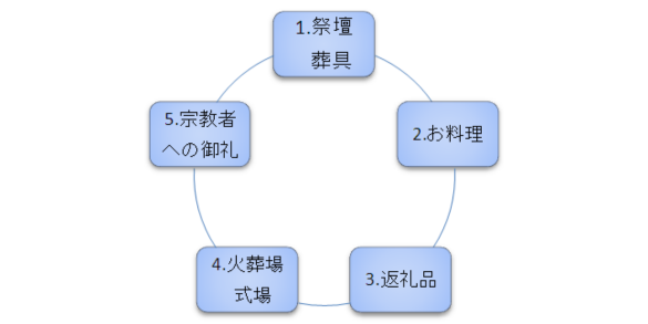 また、香典の返礼品、料理、火葬場、式場にかかる費用も